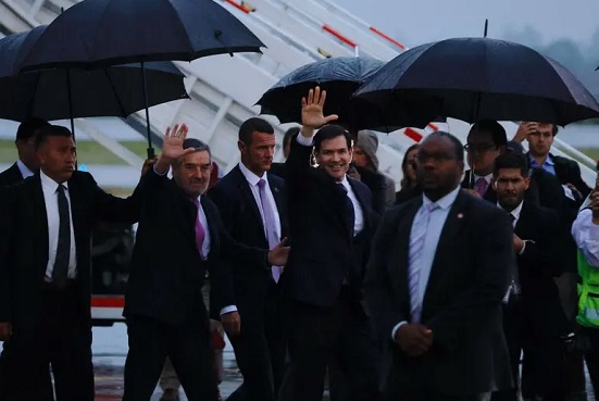 Marco Rubio, secretario de Estado de los Estados Unidos, arribó esta tarde, en medio de una fuerte lluvia, al Aeropuerto Internacional Felipe Ángeles (AIFA), en el Estado de México, donde fue recibido por el canciller Juan Ramón de la Fuente, en medio de un fuerte operativo de seguridad.