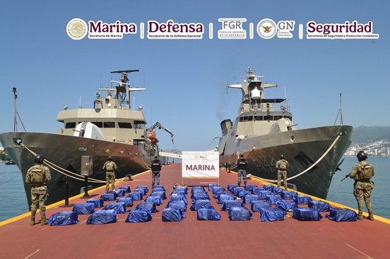 Esta acción se efectuó al realizar recorridos de vigilancia marítima y aérea para mantener el Estado de derecho, en los que participaron embarcaciones y unidades aéreas de la Armada de México, las cuales dieron seguimiento a rutas identificadas de presuntas embarcaciones dedicadas a actividades ilícitas; resultado de lo anterior fueron identificados y asegurados 54 bultos tipo costalillas, los cuales al ser inspeccionados, hallaron en su interior entre 30 a 10 grupos de bultos que sumaron 1,600 paquetes confeccionados con un peso aproximado de 1,600 kilos de cocaína.