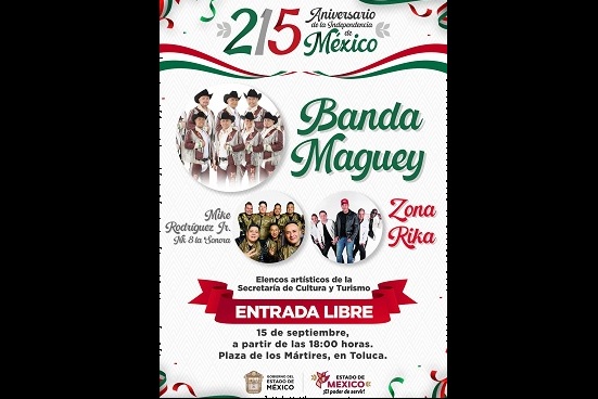 TOLUCA, Estado de México.– El Gobierno del Estado de México invita a las familias mexiquenses a conmemorar el CCXV Aniversario de la Independencia de México en una gran celebración popular que llenará de música, tradición y orgullo nacional la Plaza de los Mártires de Toluca, este 15 de septiembre a partir de las 18:00 horas.