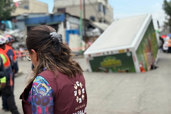 En las imágenes compartidas por las propias autoridades de Iztapalapa, se observa cómo la oquedad se “tragó” la parte trasera del vehículo, dejando la cabina y las llantas delanteras suspendidas en el aire.