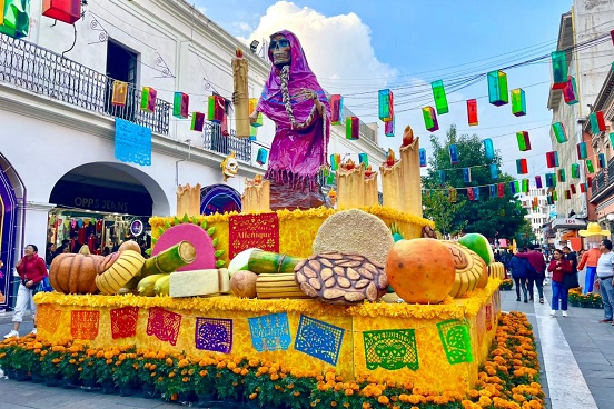 Asimismo, los asistentes pueden tomarse fotografías junto a figuras monumentales que custodian el centro de la ciudad, bellas esculturas de catrinas y xoloitzcuintles, un puente para cruzar al Mictlán y flores de cempasúchil que engalanan estos espacios.