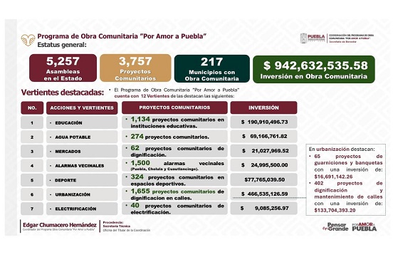 El coordinador del programa de Obra Comunitaria, Edgar Chumacero Hernández, informó que al momento suman 5 mil 257 asambleas en todo el estado donde se desarrollan 3 mil 757 proyectos prioritarios en cada uno de los 217 municipios, con una inversión de 942 millones 632 mil 535 pesos.
