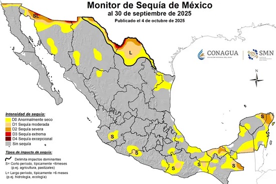 El reporte con fecha del 30 de septiembre de 2025, indica que el 15 por ciento del territorio nacional se encuentra anormalmente seco (D0), 4.8 por ciento tiene sequía moderada (D1), 2.4 por ciento con sequía severa (D2), 0.3 por ciento sequías extremas (D3) y 0.1 por ciento sequías excepcionales (D4).