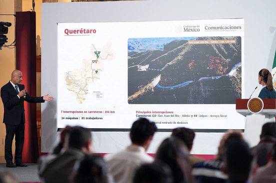 En el Salón Tesorería de Palacio Nacional, Esteva Medina dijo que, para el caso de Querétaro, hubo siete interrupciones en carreteras federales, principalmente en la 120 y 69. “Ayer se estuvo trabajando en la estabilización de algunos tramos recargando material; se han removido 13 mil 600 metros cúbicos con 24 máquinas y 85 trabajadores.