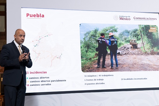 Detalló que en Hidalgo hubo 244 incidencias, 114 ya fueron atendidas; 83 caminos han sido abiertos parcialmente, 47 caminos siguen cerrados y 22 puentes afectados. En esa entidad hay 111 localidades incomunicadas y se labora con 155 máquinas y 310 trabajadores en 99 frentes.