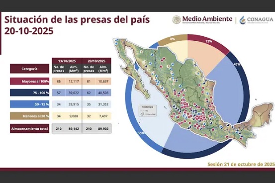 En estos momentos, 81 presas cuentan con más del 100 por ciento de almacenamiento; 62 entre 75 y 100 por ciento; 35 entre 50 y 75 por ciento y 32 tienen menos del 50 por ciento.