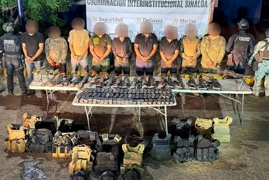 En la zona donde fueron encontrados los cuerpos y a los nueve presuntos sicarios, fueron aseguradas: 21 armas largas, dos ametralladoras, 154 cargadores, un cargador de disco, 18 chalecos balísticos con sus respectivas placas, 3,200 cartuchos y tres vehículos, dos de ellos con blindaje artesanal.