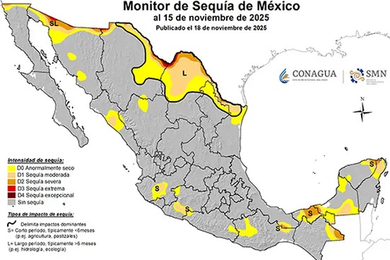 «Al 15 de noviembre de 2025, el porcentaje de áreas con sequía de moderada a excepcional (D1 a D4), a nivel nacional fue de 9.2 por ciento, cifra ligeramente mayor (0.7 por ciento) a lo registrado a finales de octubre de 2025″, indicó.