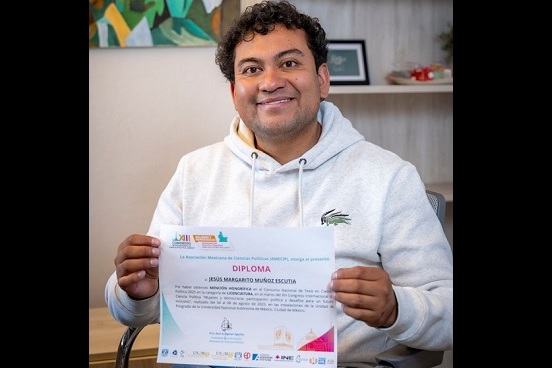 El estudio del poder, sus raíces y los mecanismos a través de los cuales se construyen las relaciones sociales fue el eje del trabajo que le valió a Jesús Margarito Muñoz Escutia, egresado de la Facultad de Humanidades de la Universidad Autónoma del Estado de México (UAEMéx), la mención honorífica en la Categoría de Licenciatura del Concurso Nacional de Tesis 2025, organizado por la Asociación Mexicana de Ciencias Políticas (AMECIP). Su investigación, titulada “Fundamentos y tensiones: un acercamiento a las nociones de Sujeto y Otredad en la Filosofía Política Moderna”, fue reconocida como una de las aportaciones más relevantes del año en el ámbito de las ciencias políticas.
