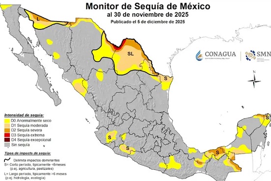 El Monitor de Sequía de México establece que 11.2 por ciento del territorio nacional se encuentra anormalmente seco (D0), 7.2 por ciento tiene sequía moderada (D1), 3.1 por ciento con sequía severa (D2), 0.2 por ciento sequía extrema (D3) y 0.1 por ciento sequía excepcional (D4).