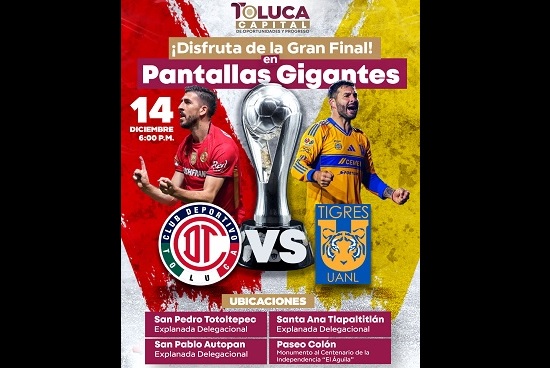 La emoción de la gran final del futbol mexicano se vive en la capital mexiquense y, con el objetivo de que la afición disfrute el encuentro en un ambiente familiar y de convivencia, el Gobierno municipal de Toluca instaló pantallas gigantes para la transmisión del partido Toluca vs Tigres 2025, este domingo a partir de las 18:00 horas.