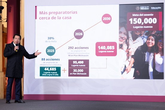 Detalló que, como parte del Plan Michoacán por la Paz y la Justicia, se llevarán a cabo 90 acciones que contemplan la construcción de 10 nuevos bachilleratos tecnológicos, 20 ampliaciones y 60 Ciberbachilleratos, con el objetivo de crear 30 mil lugares adicionales en la entidad y, con ello, contribuir a alcanzar en 2026 un total de 95 mil 400 nuevos espacios para las y los jóvenes.