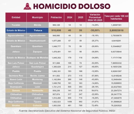 Durante la conferencia semanal La Toluqueña, el presidente municipal informó que, con base en datos del Secretariado Ejecutivo del Sistema Nacional de Seguridad Pública, hasta el mes de noviembre se tienen registrados 26 homicidios dolosos en el municipio. Con la proyección correspondiente al cierre de diciembre, Toluca alcanzará una tasa aproximada de 3.0 homicidios por cada 100 mil habitantes, cifra que la coloca únicamente por debajo de Mérida en este rubro. Este resultado representa el mejor registro de los últimos diez años en la capital mexiquense y confirma el cumplimiento de uno de los principales objetivos de la actual administración.