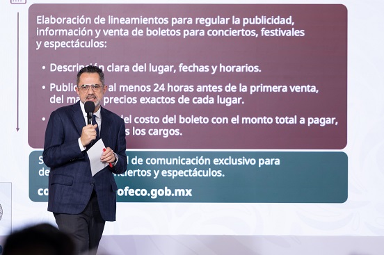 Escalante Ruiz expuso que se elaboran y revisan lineamientos para regular la publicidad, información y venta de boletos para conciertos, festivales y espectáculos, que deben contener la descripción clara del lugar, fechas y horarios; publicación, al menos 24 horas antes de la primera venta, del mapa y precios exactos de cada lugar y la especificación del costo del boleto con el monto total a pagar, incluyendo todos los cargos.