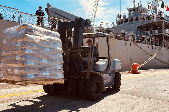 Los víveres provenientes de la Región Naval Central se concentraron en el muelle de la Administración del Sistema Portuario Nacional (Asipona) Veracruz, desde donde se realizó el embarque correspondiente.