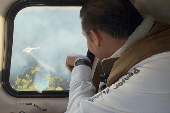 Desde el aire, el mandatario constató las acciones estratégicas que permitan contener y extinguir el fuego a la brevedad, las cuales son ejecutadas por elementos de Protección Civil del Estado, Policía Forestal, Comisión Nacional Forestal (CONAFOR) y la Brigada Coyote 7.