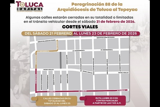 El Gobierno municipal tiene listo el operativo de cierres viales totales y parciales en distintas calles del primer cuadro de la capital para salvaguardar la integridad de las personas que participarán en la 88ª peregrinación de la Arquidiócesis de Toluca al Tepeyac.