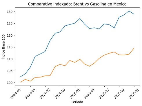 Se observa que cuando el Brent sube de forma sostenida, la gasolina también aumenta, pero de manera más moderada y con desfase.