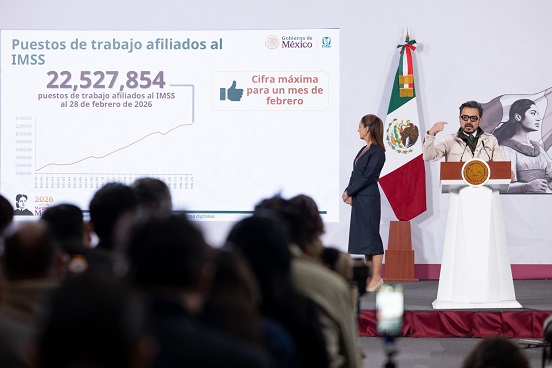 La Presidenta de México, Claudia Sheinbaum Pardo, informó que, al 28 de febrero de 2026, se registraron 22 millones 527 mil 854 puestos de trabajo afiliados al Instituto Mexicano del Seguro Social (IMSS), cifra máxima para un mes de febrero, la quinta más alta del país. Además, resaltó que tan solo en febrero se crearon 157 mil 882 puestos.
