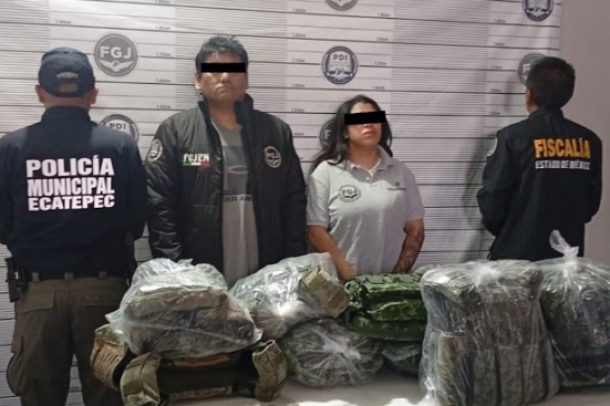 Rafael Daniel “N” de 41 años de edad, portaba una chamarra negra con logotipos FGJEM en la espalda, y escudo de la PDI, además de siete bolsas tipo ziploc con substancia granulada con características propias del cristal; y Jenifer Evelyn “N” de 20 años vestía una playera gris con estampado de FGJEM y escudo de PDI y tenía en posesión seis bolsas transparentes con hierba verde seca, con características de la marihuana.