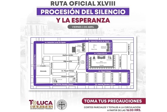El Gobierno municipal llama a la ciudadanía y visitantes a tomar previsiones ante los cierres viales que se implementarán este viernes 3 de abril, con motivo de la tradicional Procesión del Silencio y la Esperanza.