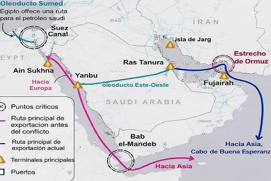 El estrecho de Bab el-Mandeb, ubicado entre Yemen y el cuerno de África, junto con el estrecho de Ormuz, cercano a Irán y Arabia Saudita, concentran una proporción significativa del tránsito global de hidrocarburos. Su eventual cierre simultáneo es considerado un escenario catastrófico, debido a que por estas rutas circula cerca de un tercio del petróleo mundial, además de un porcentaje relevante de gas y fertilizantes.
