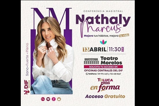 La Presidenta del DIF Toluca, Rocío Pegueros, promueve la salud preventiva y el bienestar integral de la población a través del reto “Toluca se Pone en Forma”, el cual dentro de las herramientas para adoptar hábitos saludables, trae la conferencia magistral de Nathaly Marcus.