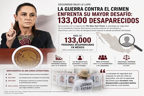 Ciudad de México.— La estrategia de seguridad del gobierno de la presidenta Claudia Sheinbaum enfrenta uno de sus retos más complejos y delicados: la crisis de personas desaparecidas, que ya supera las 133 mil víctimas en el país, de acuerdo con información retomada por el diario estadounidense The New York Times, que advierte sobre un escenario preocupante para la actual administración federal.
